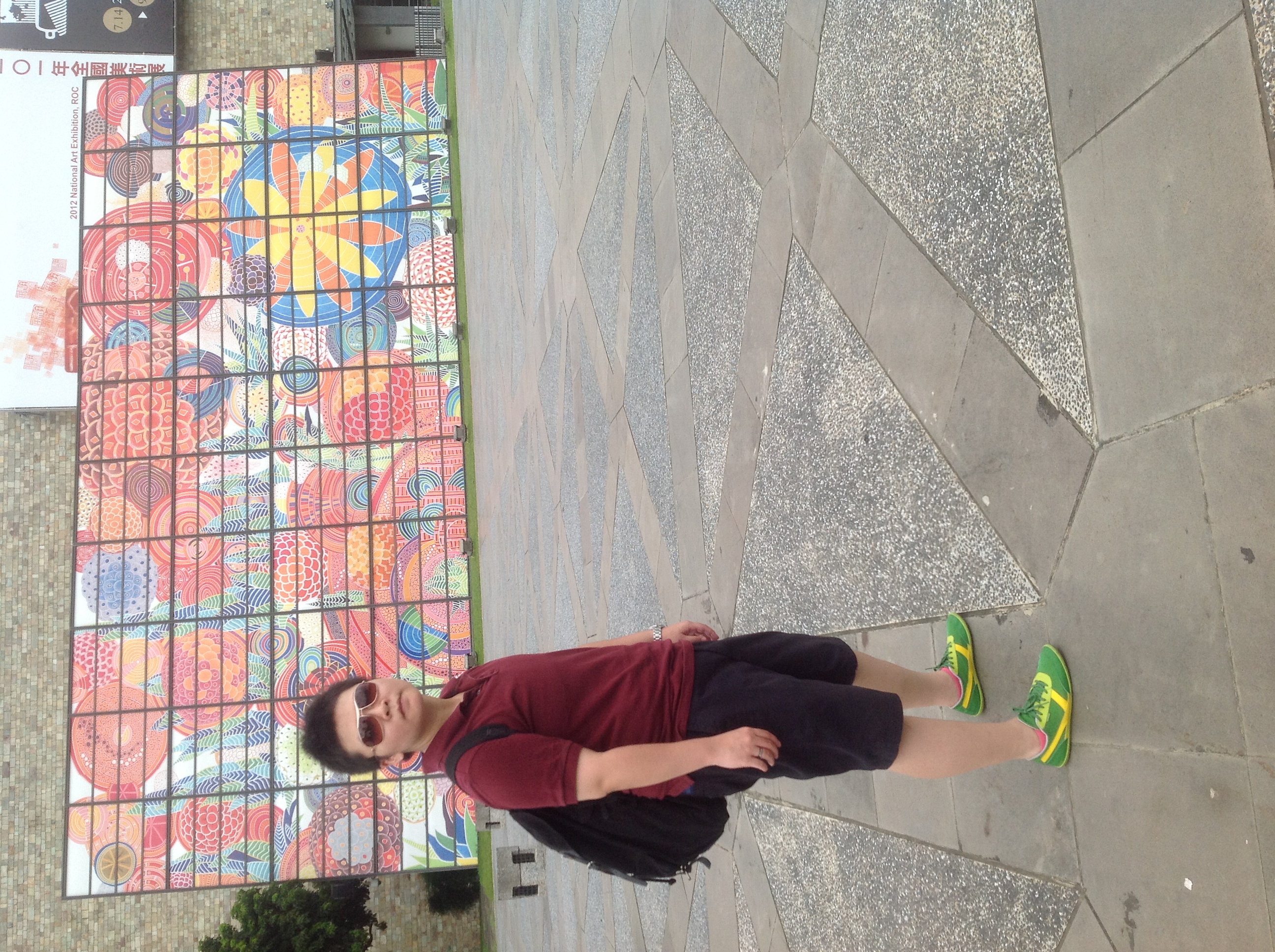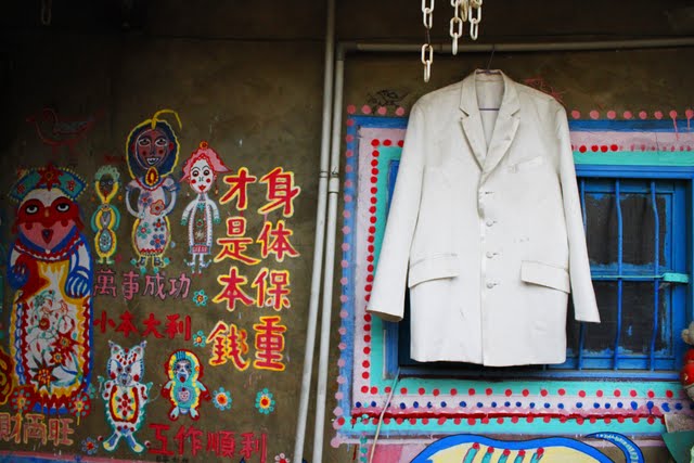 選定的飯店就在大肚山上,騎車往郊區的路上還經過去年一月曾經拜訪的彩虹村,當時是冬天,還記得從新竹騎摩托車到台中的寒風刺骨,往彩虹村的路上也曾經迷路過,許多單眼相機穿梭在彩虹巷弄中,陽島太太在繽紛裡留下倩影。鑒於此次時間不多,就沒再進去看彩虹阿伯的新作,謹以舊照致敬之。