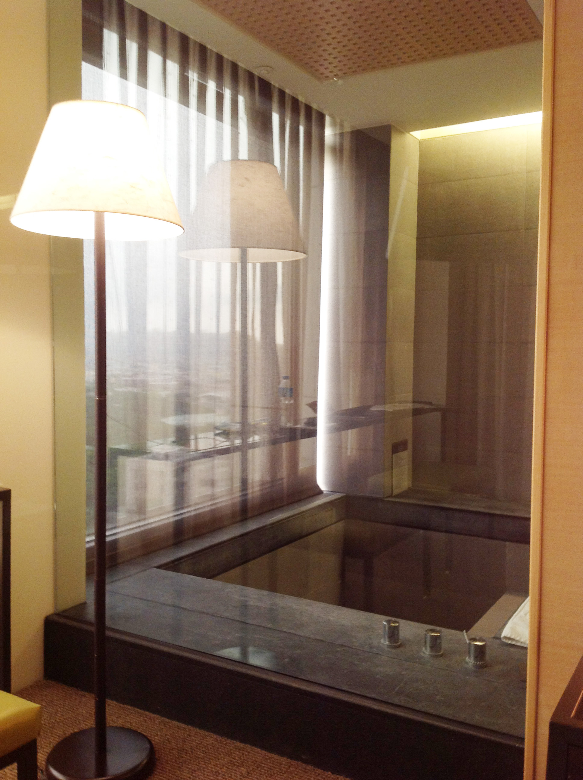 令人期待的觀景溫泉池,不巧地剛好落在山景的那側,雖然也有大片玻璃白天看出去好像景色怡人,不過一到晚上就黑成一片,旁邊不遠就有高度矮一點點的建築物,所以當晚使用浴池時,直接就拉下紗簾外的那層不透光窗簾。