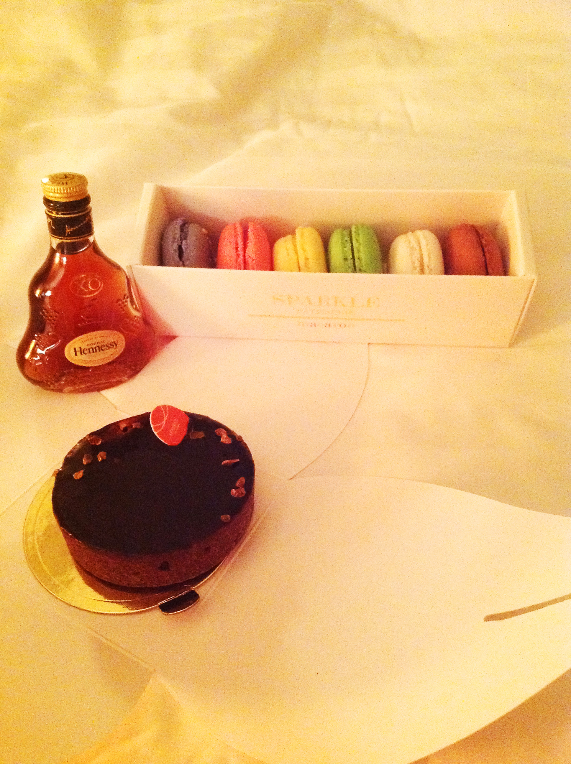 兩人看起來像住在客家庄的農婦,穿著飯店提供的兩件式和服,享食貴婦下午茶店的外帶甜點,生巧克力塔吃起來的口感跟蛋糕不太一樣,雖然有點美中不足,但是一口巧克力一口干邑還眞搭(顯示為比壽星享受的狀態),在貴婦下午茶買的全套馬卡龍肚子裝不下,帶回家當餘味慢賞。